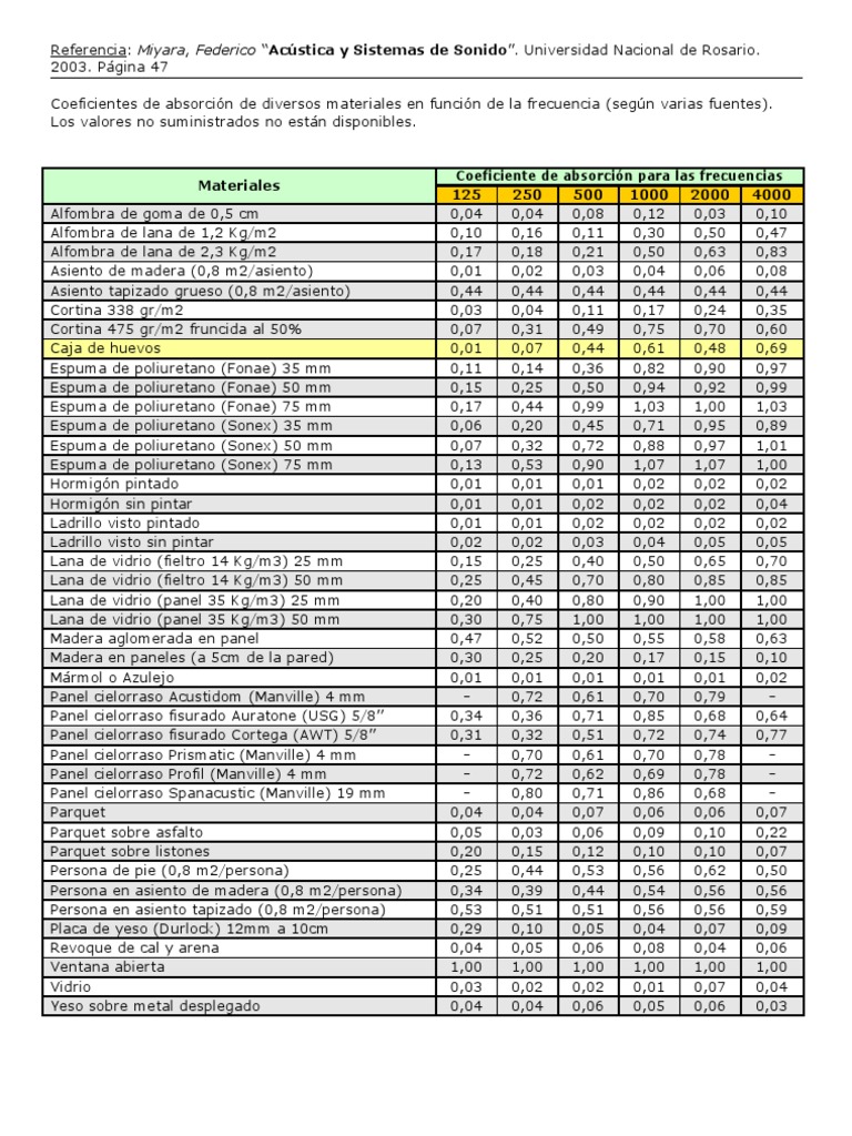 En la siguiente tabla se muestran los coeficientes de absorción acústica en función de la frecuencia para distintos materiales empleados habitualmente en la construcción: Esta otra es una tabla que contiene los mismo valores pero en esta caso para las opciones de acustización del mercado. De esta forma se eliminaron los efectos acústicos no deseados y se obtuvieron los coeficientes de reflexión, absorción y transmisión del material.
